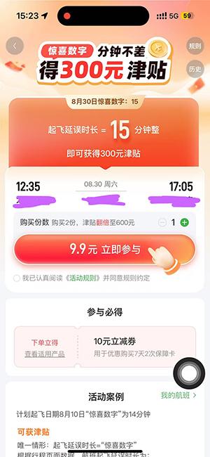 随后,记者以9.9元投保,记者赢得是8月30日的惊喜数字15。投保页面瞎想色调绚丽,写着“惊喜数字,分钟不差,得300元津贴”“升空延误时长=15分钟整,即可赢得300元津贴”。